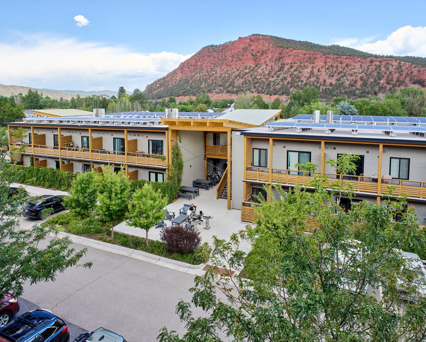 Red Hill Lofts embraces sustainable design principles to ensure convenient access to transit, amenities, services, and employers through walking and biking. The design includes trail connections to the nearby RFTA BRT stop and Rio Grande Trail. Adhering to Enterprise Green Communities standards, the project boasts a high development density of 26 units per acre. The commitment to sustainability is further demonstrated with Energy Star Appliances, water-conserving fixtures, high-performing insulation, and windows, and a photovoltaic, 100% electric design. Collectively, these features contribute to an environmentally conscious and forward-thinking residential development at Red Hill Lofts.